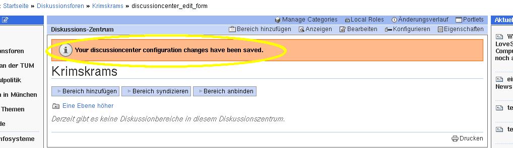 - Diese Einstellungen können mit dem grauen Button 'Einstellungen speichern' ('Save settings') unten links gespeichert werden oder mit dem Button 'Rücksetzen' gelöscht werden. Nach dem Speichern der Einstellungen kommt eine neue Seite mit dem Hinweis in orangefarbenem Balken 'Your discussioncenter configuration changes have been saved' (Abb. 8); darunter ist der Titel und die Description des neuen Diskusssionsforums zu sehen.