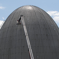 Sitemap > Media > News > Dacharbeiten am Atom-Ei > Dachdecker versehen das Atom-Ei mit Aluminiumpaneelen.