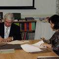 TUM-Vizepräsidentin Prof. Dr.-Ing. Liqiu Meng und der Rektor der brasilianischen Universidade Estadual de Campinas, Prof. Dr. Fernando Ferreira Costa, unterzeichnen einen Vertrag über Austausch und Zusammenarbeit ihrer Universitäten.
