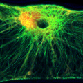 Zytoskelett einer Gerstenzelle, in die gerade ein Schadpilz einzudringen versucht (Quelle: Caroline Hoefle / TUM)
