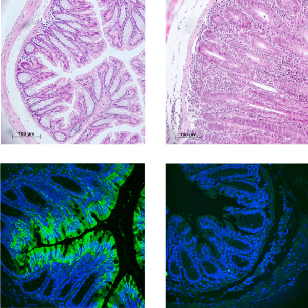 Sitemap > Presse & Kommunikation > Pressemitteilungen > Neuer Auslöser von chronischen Darmentzündungen entdeckt > Durchlässige Schutzbarriere: Fehlt das abdichtende Protein E-Cadherin (hellgrün), entstehen Darmentzündungen (rechts). Bild: TUM