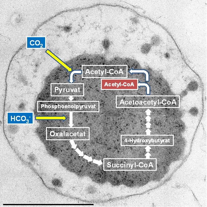 Vereinfachtes Schema des neuen Kohlendioxid-Fixierungsweges , Vereinfachtes Schema des neuen Kohlendioxid-Fixierungsweges von Ignicoccus hospitalis; Maßstab der Abbildung: 1 µm
