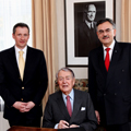 Vertragsunterzeichnung in Essen: Prof. Berthold Beitz (Krupp-Stiftung, Mitte), Prof. Lueth, Prof. Herrmann (TUM)Vertragsunterzeichnung in Essen für das Alfried Krupp-Zentrum Medizintechnische Systeme für eine älter werdende Gesellschaft an der Technischen Universität München, vlnr.: Prof. Dr. Tim C. Leuth (IMETUM), Prof. Dr. h.c. mult. Berthold Beitz (Vorsitzender Krupp-Stiftung), Prof. Dr. h.c. mult. Wolfgang A. Herrmann (Präsident TUM); auf dem Bild im Hintergrund: Dr.-Ing. E.h. Alfried Krupp von Bohlen und Halbach (Foto: Peter Wieler / Krupp-Stiftung)
