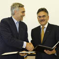 Sitemap > Media > Press releases > Siemens und TU München vertiefen Zusammenarbeit > Siemens-Vorstandsvorsitzender Peter Löscher und TUM-Präsident Wolfgang A. Herrmann bei der Vetragsunterzeichnung (Foto: Siemens AG)