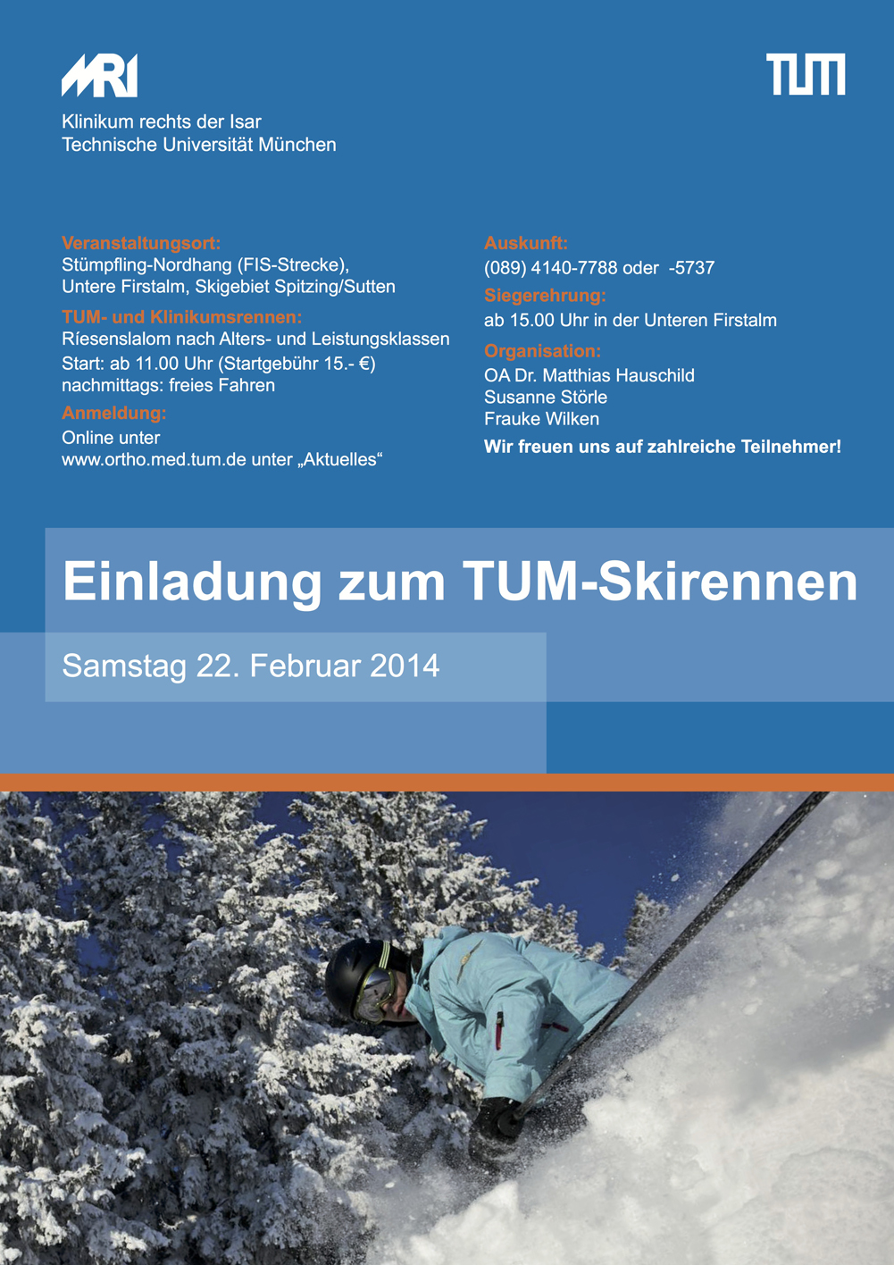 Die Klinik für Orthopädie und Sportorthopädie lädt alle TU-Mitarbeiter/innen zum traditionellen TU-Skirennen aller Fakultäten und Abteilungen am 22.02.2014 im Skigebiet Spitzingsee ein.