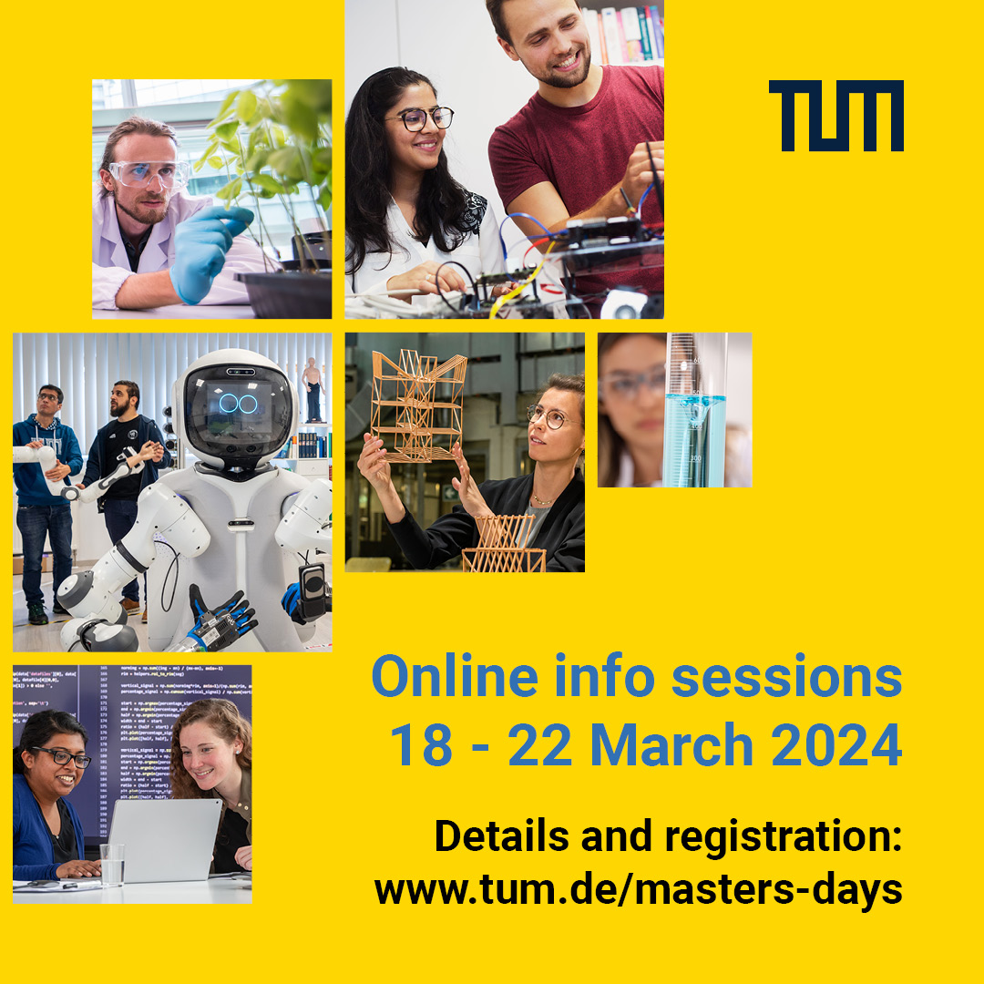 Die vielfältigen Studienmöglichkeiten an der TUM im Masterbereich werden bei den Master’s Days 2024 im virtuellen Format vom 18.03. bis zum 22.03.2024 vorgestellt. Interessent:innen haben hierbei die Möglichkeit sich inhaltlich über Masterprogramme zu informieren sowie in Kontakt mit Ansprechpersonen der verschiedenen Schools und Servicestellen der TUM zu treten. Fragen zu Bewerbungsabläufen, Schwerpunktsetzungen als auch zu einem Fachrichtungswechsel können geklärt werden. Serviceeinrichtungen der TUM informieren zu diversen Themen wie Wohnen in München, Übergang in das Berufsleben oder die Forschung und ermöglichen zukünftigen Studierenden damit, das Studium an der TUM und die nachfolgenden Schritte in Richtung Karriere vorausschauend zu planen.